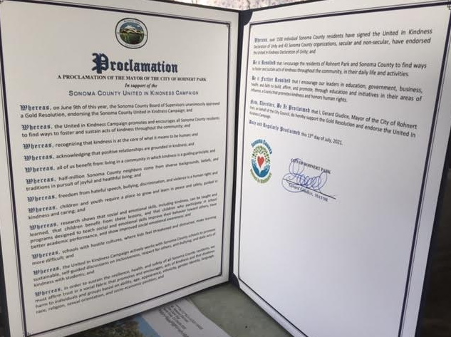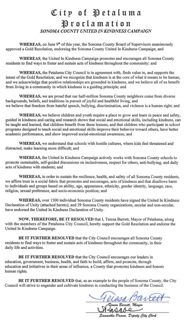 Resolved: That over half a million Sonoma County neighbors come from diverse backgrounds, beliefs, and traditions in pursuit of joyful and healthful living and wish to be free from hateful speech, bullying, discrimination, and violence and that students require a place to grow and learn in peace and safety, guided in kindness and caring.