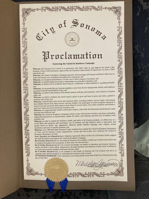 Whereas, the United In Kindness Campaign actively works with school systems within Sonoma County to